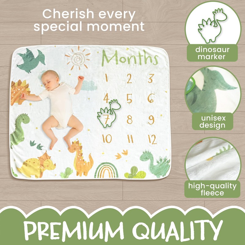 - [Unisex Dinosaur Design]: With a exclusive and beautiful dinosaur neutral design, our Newborn monthly milestone blanket will help you capture every precious moment and preserve warm and beautiful memories of growth. Whether using it as baby photo props or for everyday snuggles, this dinosaur baby blanket is a must-have for new parents.