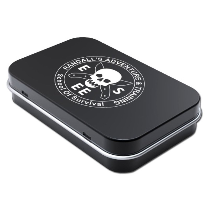 - Black tin with Randall's Adventure - School of Survival logo in white
