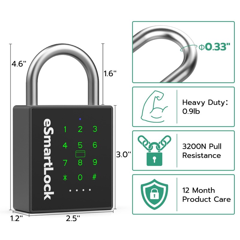 Welcome to Eseesmart Store! The smart padlock is a remarkable choice! It offers versatile unlocking options like RFID card, passcode, Apple Watch, Mobile App via Bluetooth, and a backup mechanical key for an intelligent and effortless life. It's military-grade robust, passing 7 strict tests with a hardened shackle and pick-resistant keyhole for ultimate security. It's all-weather ready with IP67 protection and a wide temperature range. The built-in 500mAh battery ensures a 12-month standby and 8000 unlocks. Made of high-quality stainless steel, it's secure and suitable for various places. Enjoy 6-month free trial and lifetime technical support. Replace or refund within 6 months hassle-free. Eseesmart's Smart Padlock----Your best choose!