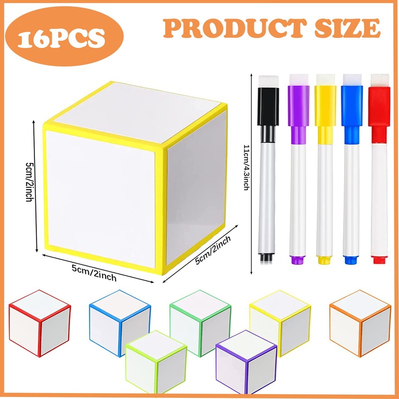 - Multiple Colors: dry erase cubes are in various colors, including red, blue, yellow, green, orange and purple, measure approx. 5 x 5 x 5 cm/ 2 x 2 x 2 inch; Dry erase marker is approx. 11.3 cm/ 4.5 inch, bright and vibrant, which can attract boys' and girls' attention, and then stimulate their interest in learning
