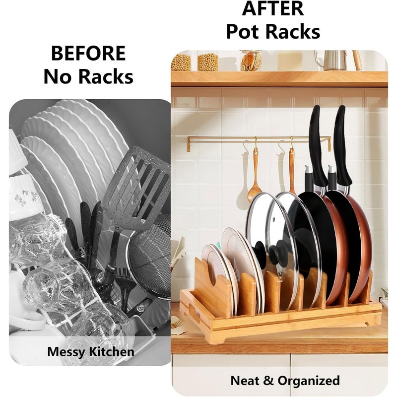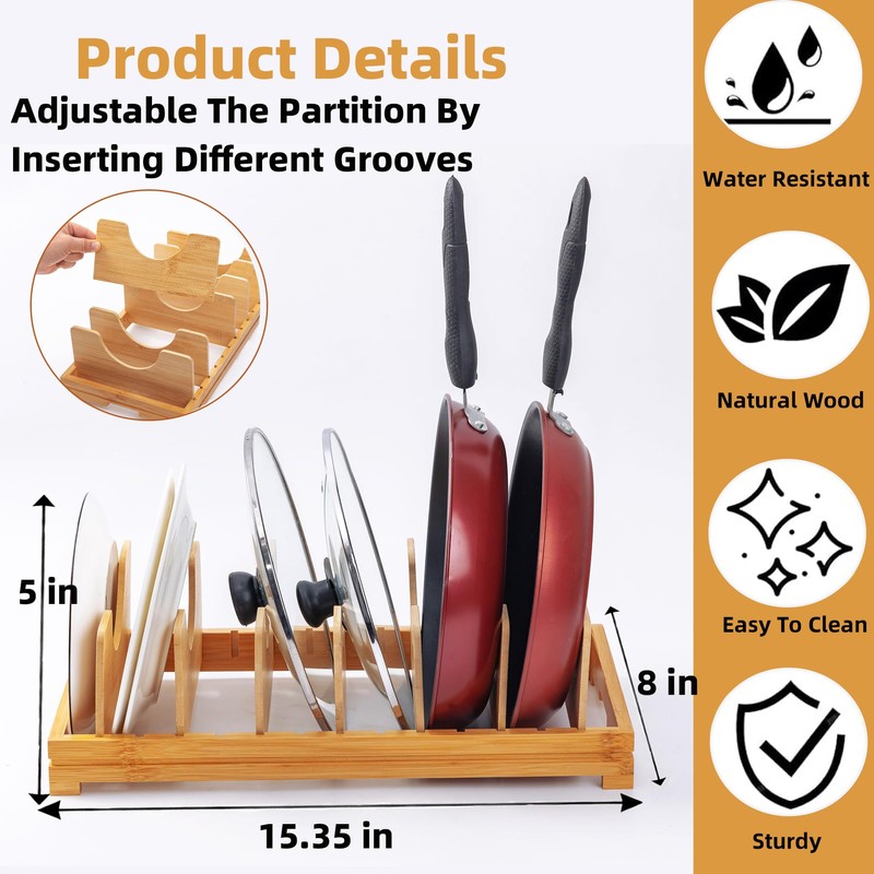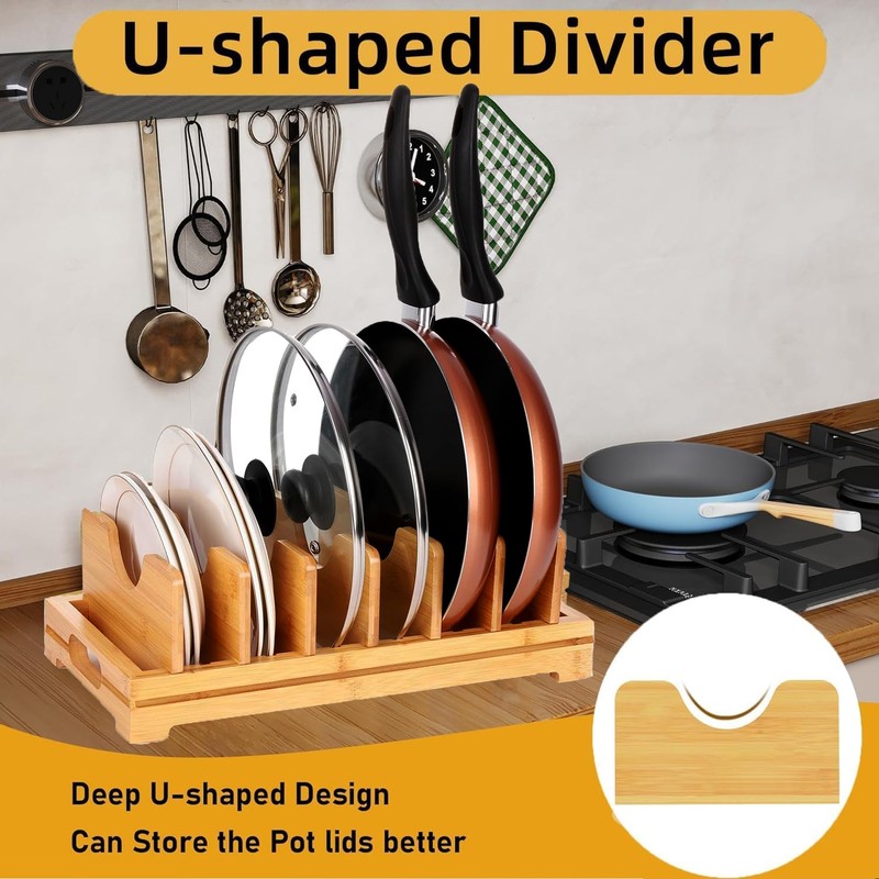 - 【Widely Used and Stored】- Our bamboo pot lid organizer with adjustable dividers is not only a pots and pans organizer under cabinet, but can also be used in drawers, countertops, or cupboards. It efficiently stores pots and pans lids, cookie sheets, baking sheets, cutting boards, frying pans, bakeware, plates, and more.