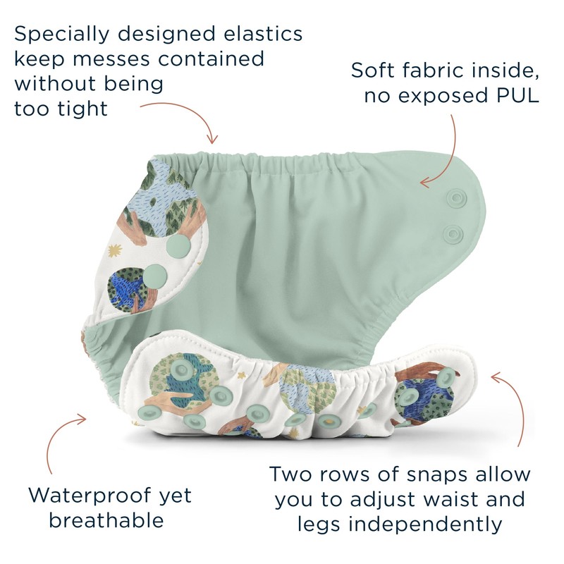 Esembly reusable cloth diapers are made up of two parts: an absorbent Inner (sold separately) and a waterproof Outer. Waterproof yet breathable, Esembly Outers are soft, stretchy, and trim-fitting. Even better, they’re made of Oeko-Tex-certified recycled fabric from 100% post-consumer plastic bottles!