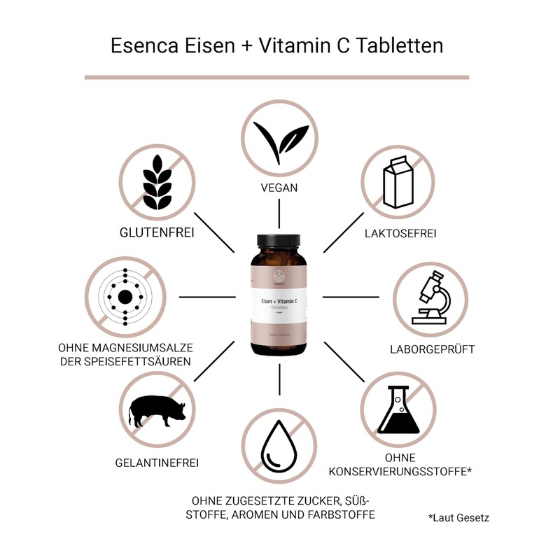 Esenca Iron Tablets with 40 mg Natural Vitamin C - Vegan & Laboratory Tested