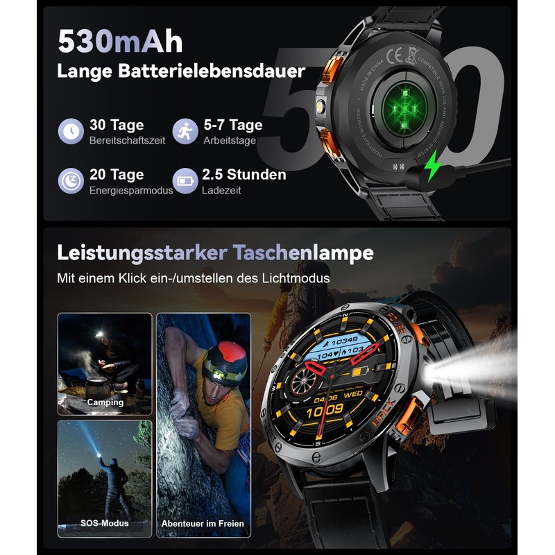 - Tactical men's smartwatch 530 mAh: This smartwatch is equipped with a 530 mAh high capacity battery that delivers twice as much energy as conventional smartwatches. Combined with an advanced energy-saving AI algorithm, energy consumption is significantly reduced, making it ideal for longer sports sessions. The charging time is 3 hours, and when fully charged, the smart watch offers a battery life of 7 to 10 days depending on use.