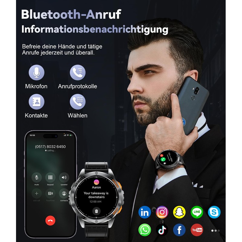 - Men's smartwatch: calls and messages: this men's smartwatch uses Bluetooth 5.0 for a fast, stable connection. With the built-in 60dB speaker and noise cancelling microphone, calls are clear. After connecting to your smartphone, you can answer, make and receive message notifications from SMS, Facebook, WhatsApp and Instagram. Voice assistant enables tasks via voice command.