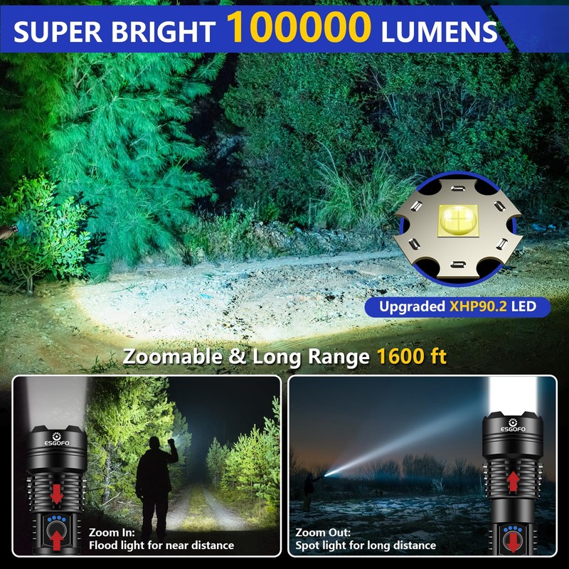 Esgofo Rechargeable LED Flashlight 10000 Lumens, PHX90 Super Bright Multifunctional Strong Flashlights, High Power Handheld USB C Flash Light, Long Lasting, Long Range for Emergencies Camping Hiking