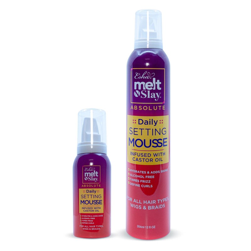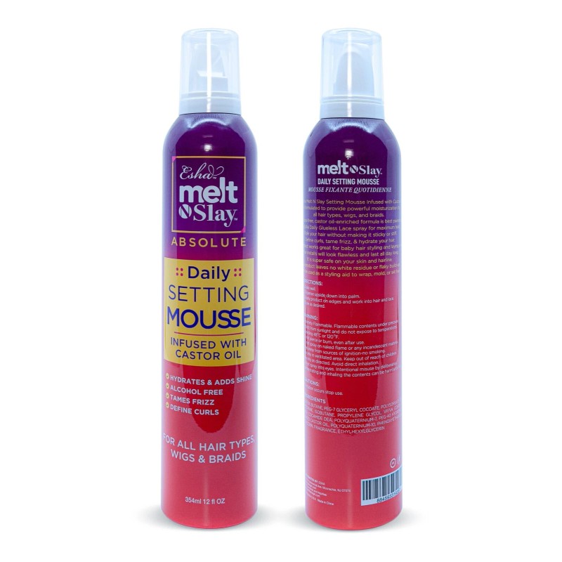 The Melt N Slay Setting Mousse Infused with Castor Oil is formulated to provide powerful moisturization for all hair types, wigs, and braids. This alcohol-free, castor oil-enriched formula is best paired with the Esha Daily Glueless Spray for maximum hold. Style your hair without making it sticky or stiff. Define curls, tame frizz, & hydrate your hair. This product works great for baby hair styling and laying a wig. Your installs will look flawless and will last all day long. It is super safe on your skin and hairline. This product leaves no white residue or flaky build-up. Can be used as a styling aid to wrap, mold, or set hair.