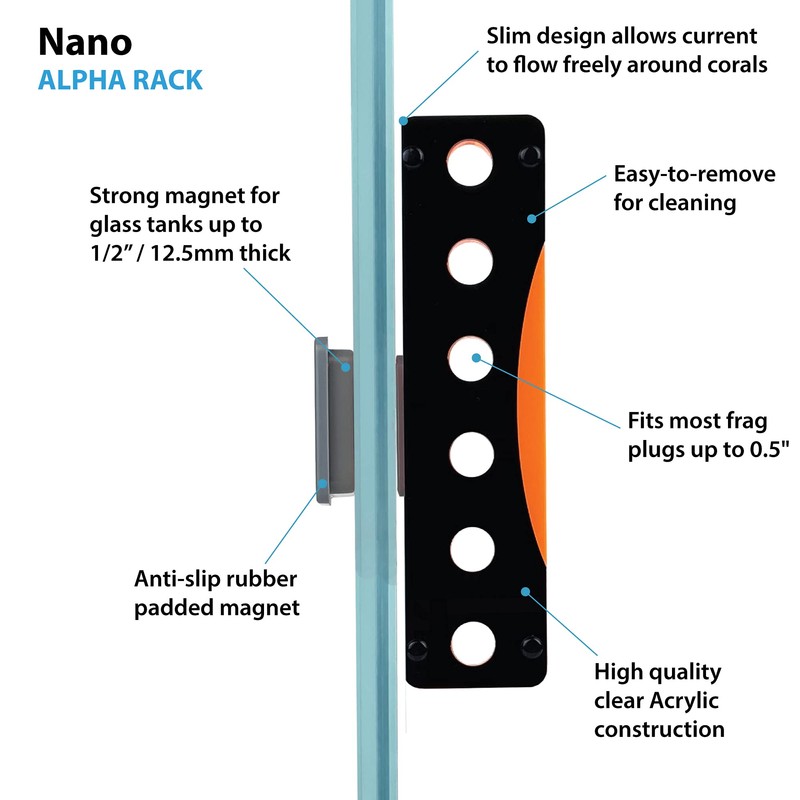 - Strong Anti-Slip Magnet – Rubber coated magnet design attaches racks to glass up to ½ in. (12.5 mm) thick. Anti-slip rubber magnets ensure racks stay secure in water currents, even when loaded with frags.