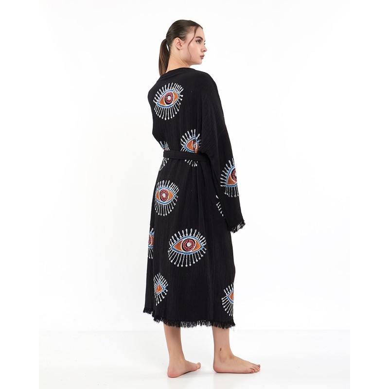 esma cim ec peştemalcim Black Color Evil Eye Pattern Turkish Kimono Robe, Beach Cover Up, Organic Cotton
