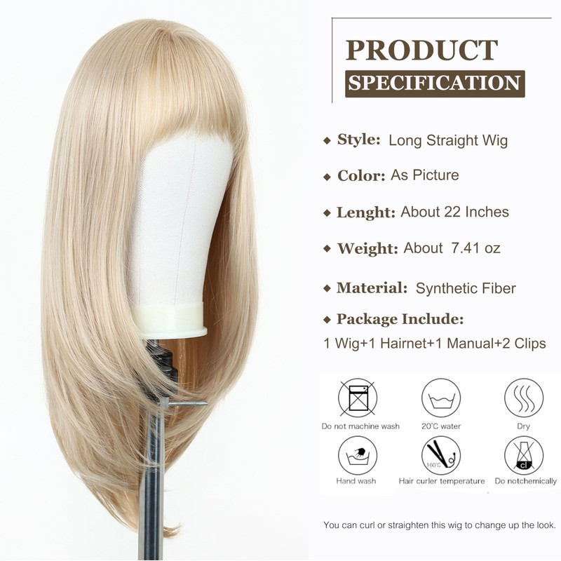 Esmee Long Straight Blonde Wigs for Women with Fringe, Natural Looking Synthetic Hair Wig for Daily Use & Party