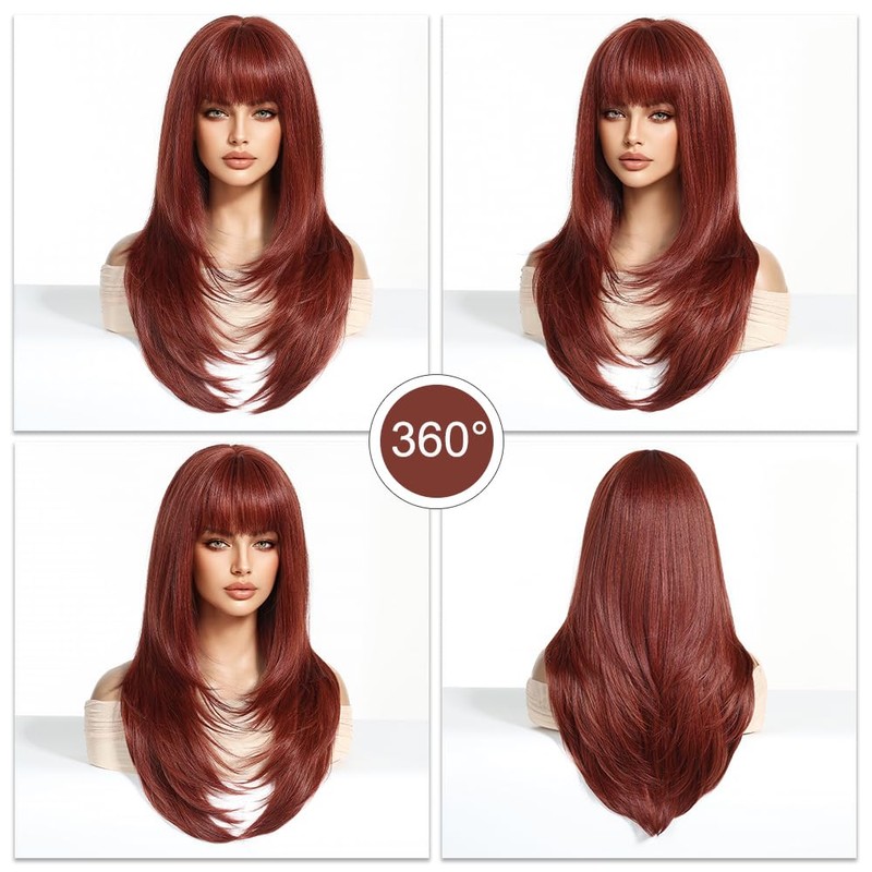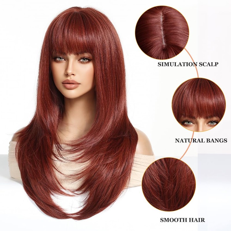 Esmee Long Straight Burgundy hair Bangs Layered wig for Women Breathable Comfortable Natural Realistic Women Party Wigs Use-24 Inches