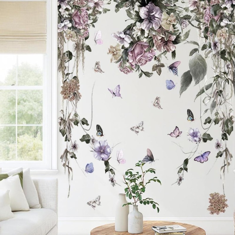 Esmee purple petunia peony butterfly flower vines bedroom living room entrance home wall decoration wall stickers(peel and stick wall decals)