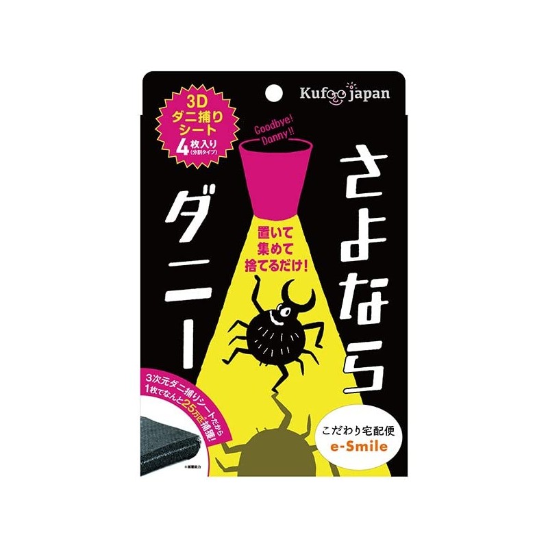 - ■ Product Name: Goodbye Danny ■ Uses: Dust Mite Trapping Sheet ■ Material Sheet Part: Urethane, Adhesive Part: Acrylic Acid, Attractant: Fragrance (Food Additives), Non-Woven Fabrics: Polypropylene; Size Sheet (4.7 x 2.6 x 0.4 inches (120 x 65 x 10 mm) x 4 ■ Sold by Ease Smile ■ Usage Notes: ● Please do not use outside of intended purpose. Please install immediately after opening. When storing, please cover it tightly with vinyl, etc., and avoid dust or other particles from entering the sheet, the effect will not fade. Effects may vary depending on the environment used. If you see any abnormalities on your body, please stop using it immediately. Please do not use in areas that come into contact with the skin directly, or in areas that come into contact with pets or children. Keep out of reach of children. Do not place this product near a fire, in a location that gets wet with water, or in direct sunlight. It is not effective for blood absorbing dust mites. ● This product has a small scent of attractant