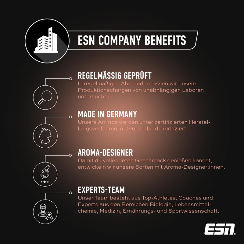 - Excellent taste: with us you are spoilt for choice. Our ESN Aminos delight with a juicy excellent taste - no matter which variety you choose