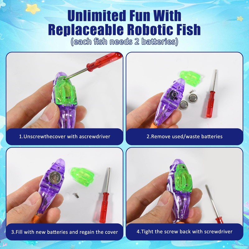- Sensor-Activated Automatic Swimming: Simply touch both sides of the fish sensor and drop into water to activate! Our robotic fish toys swim autonomously with no remote needed—perfect for self-play enrichment. When removed from the cat bath, they automatically shut off to conserve battery life (includes 6 extra batteries + screwdriver).