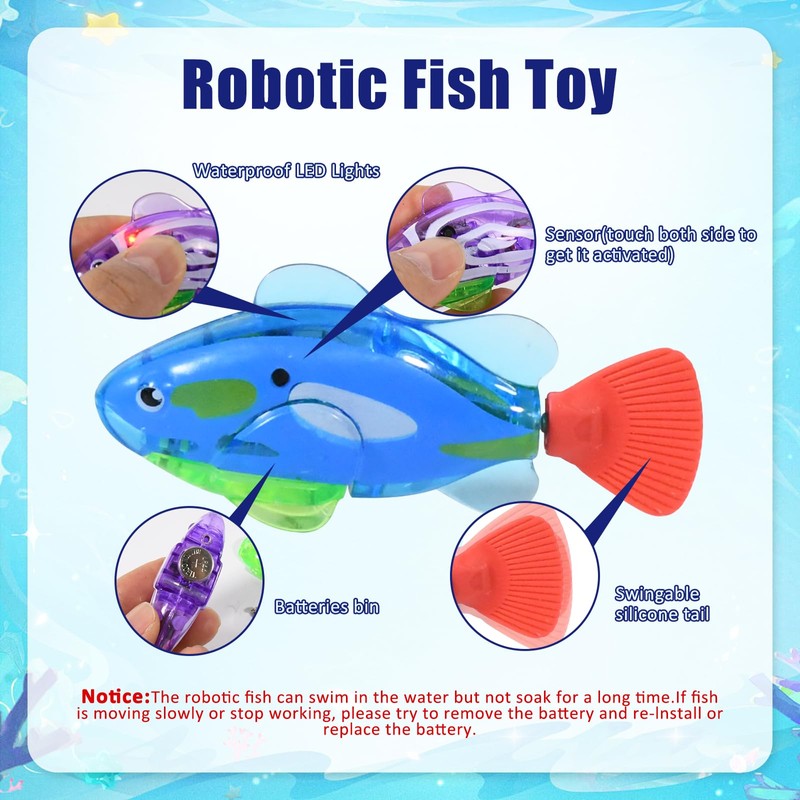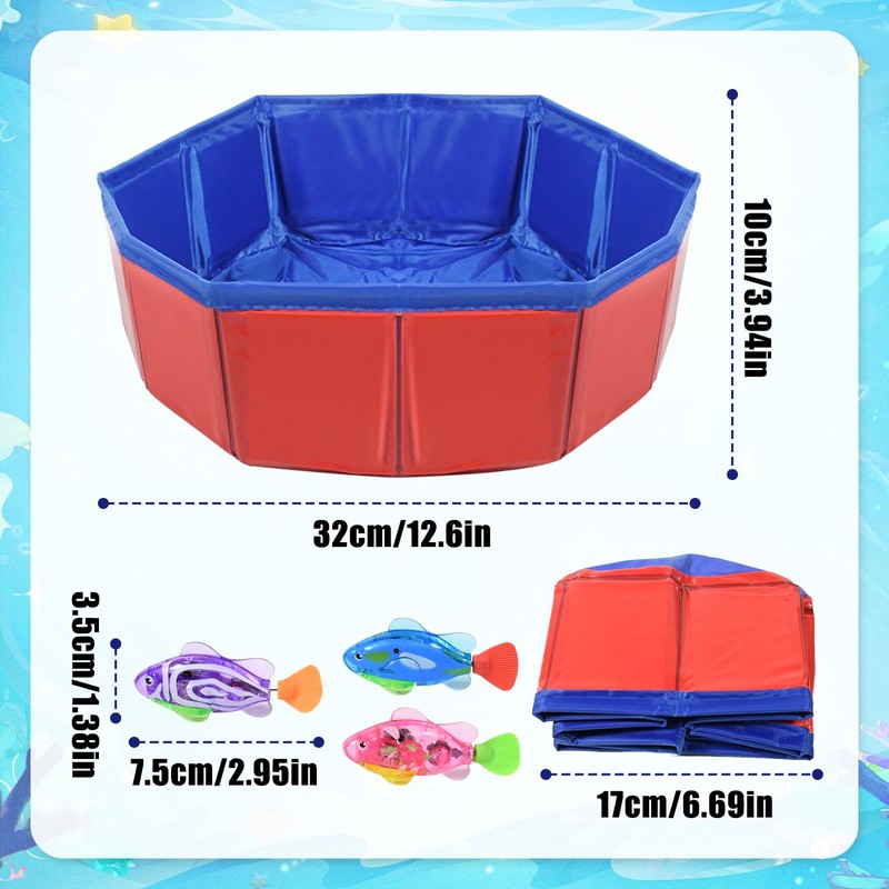 - Ultimate Gift-Ready Bundle: Includes 3 LED robot fish, a sturdy cat swimming pool, and 6 extra batteries—everything for instant entertainment! Packaged as a festive gift, it’s perfect for birthdays, Christmas, or spoiling your feline. A unique alternative to traditional cat toys, promoting healthy exercise and water confidence.