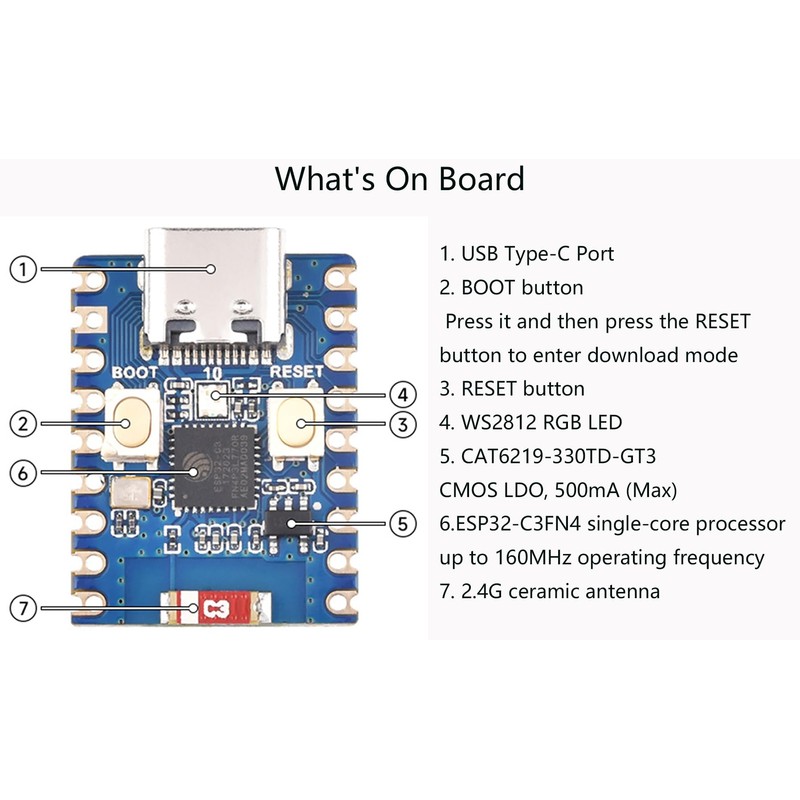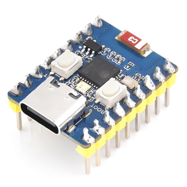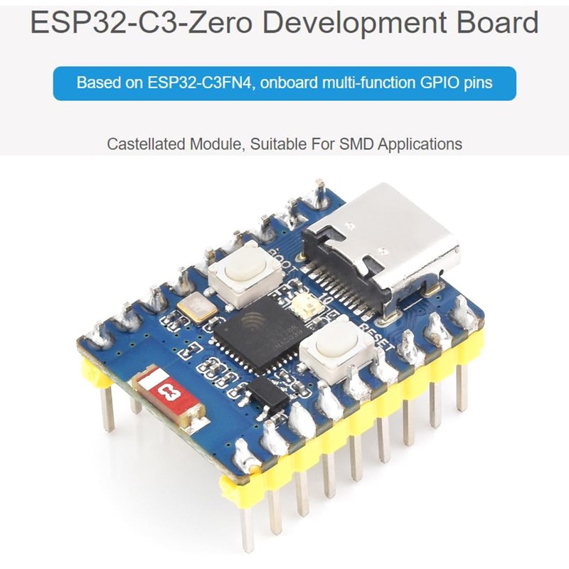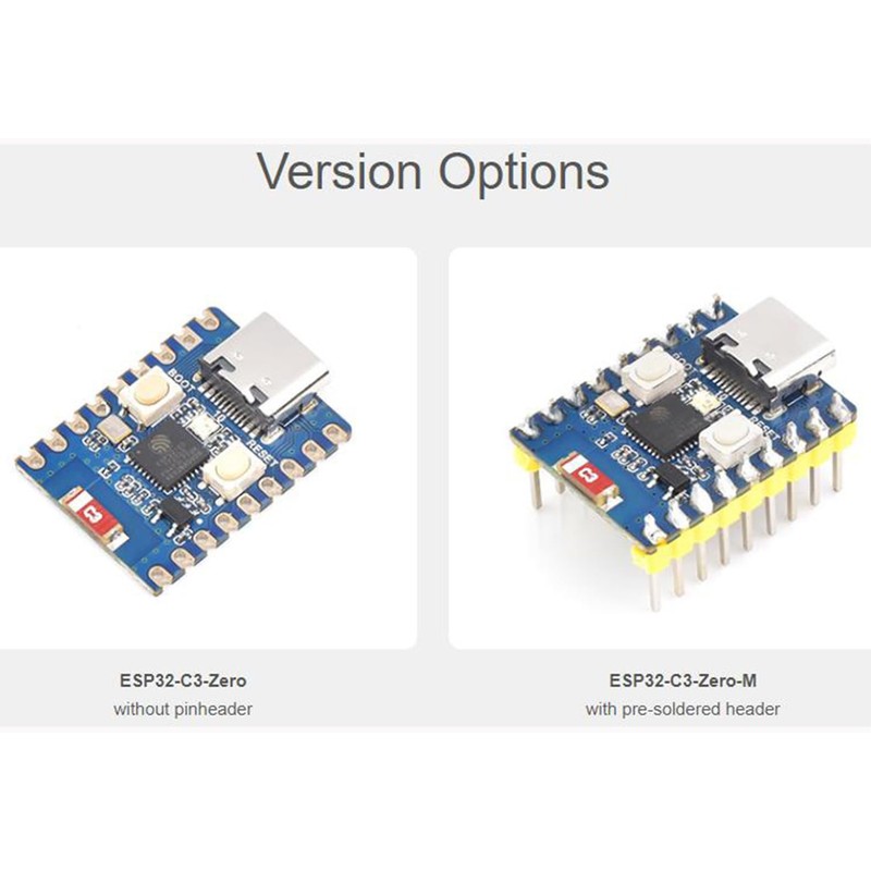 - ESP32-C3 with Pre-Soldered Header Mini Development Board, Based on ESP32-C3FN4 Single-core Processor. Low-power SoC equipped with RISC-V 32-bit single-core processor, up to 160MHz main frequency