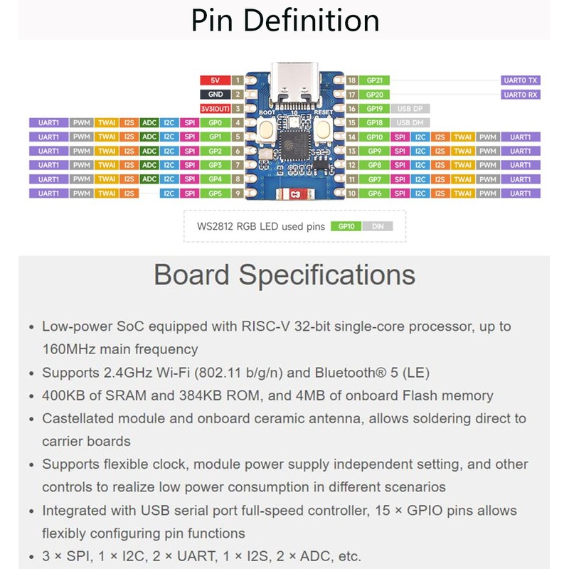 - Integrated with USB serial port full-speed controller, 15 x GPIO pins allows flexibly configuring pin functions. 3 x SPI, 1 x I2C, 2 x UART, 1 x I2S, 2 x ADC, etc.