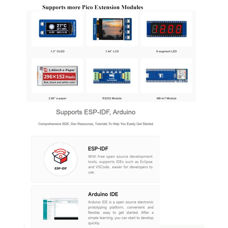 You can choose ESP-IDF, Arduino or other development environments in software so that you can easily and quickly get started and apply it to the product.