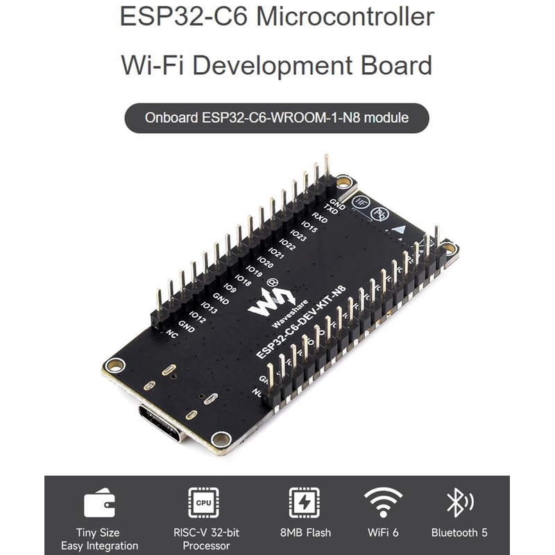 - Adopts ESP32-C6-WROOM-1-N8 module with RISC-V 32-bit single-core processor, up to 160MHz main frequency, built-in 8MB Flash