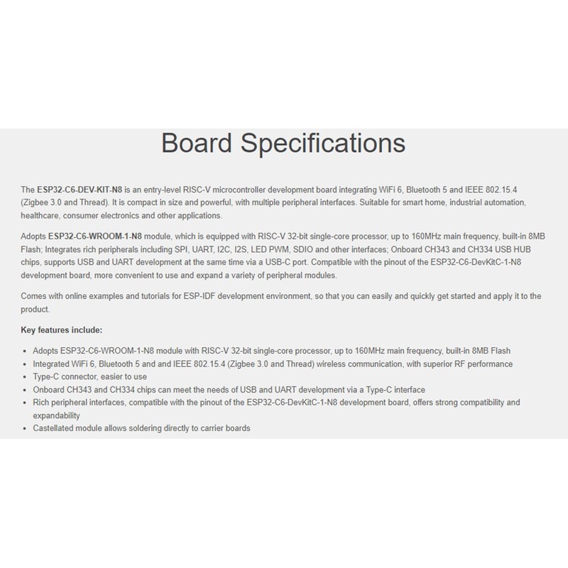 The ESP32-C6-DEV-KIT-N8 is an entry-level RISC-V microcontroller development board integrating WiFi 6, Bluetooth 5 and IEEE 802.15.4 (Zigbee 3.0 and Thread). It is compact in size and powerful, with multiple peripheral interfaces. Suitable for smart home, industrial automation, healthcare, consumer electronics and other applications. Adopts ESP32-C6-WROOM-1-N8 module, which is equipped with RISC-V 32-bit single-core processor, up to 160MHz main frequency, built-in 8MB Flash; Integrates rich peripherals including SPI, UART, I2C, I2S, LED PWM, SDIO and other interfaces; Onboard CH343 and CH334 USB HUB chips, supports USB and UART development at the same time via a USB-C port. Compatible with the pinout of the ESP32-C6-DevKitC-1-N8 development board, more convenient to use and expand a variety of peripheral modules. Comes with online examples and tutorials for ESP-IDF development environment, so that you can easily and quickly get started and apply it to the product. Here it is: bit.ly/3s0Zjh3