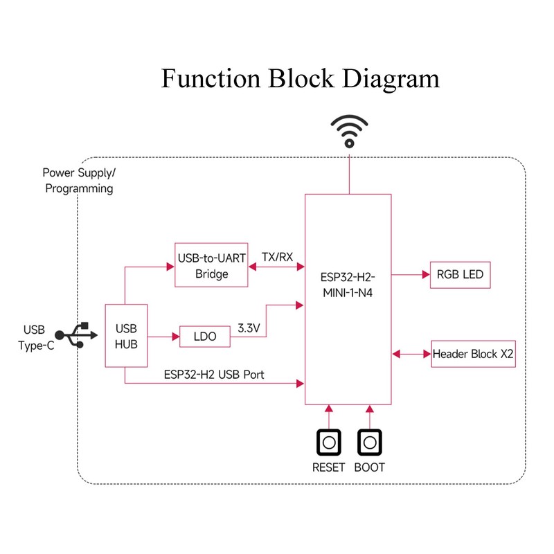- Adopts ESP32-H2-MINI-1-N4 module, which is equipped with RISC-V 32-bit single-core processor, up to 96MHz main frequency, built-in 4MB Flash; Integrates rich peripherals including SPI, UART, I2C, I2S, LED PWM, ADC and other interfaces