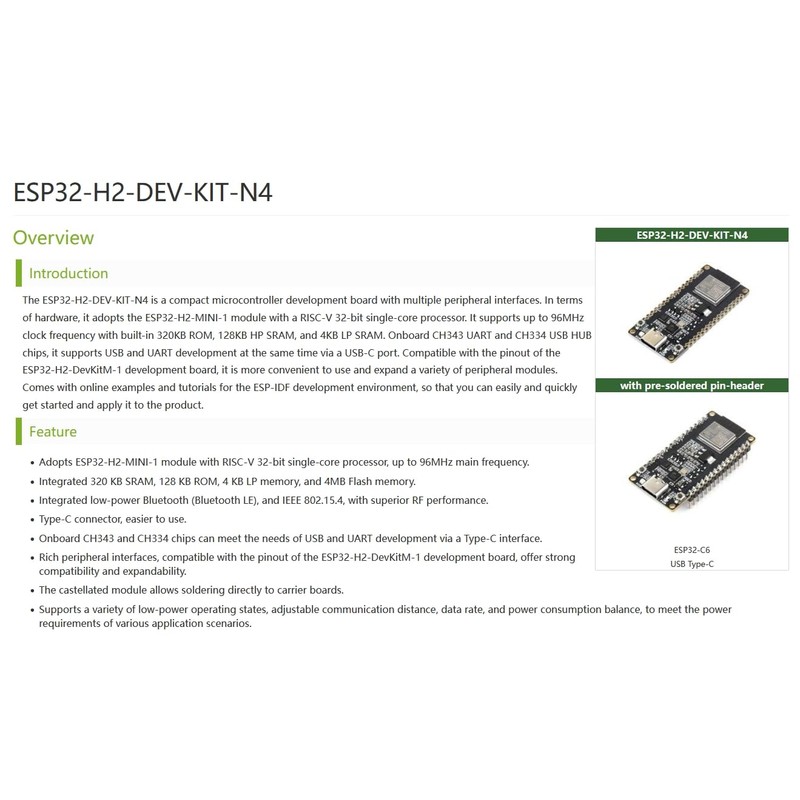 The ESP32-H2-DEV-KIT-N4 is an entry-level RISC-V microcontroller development board integrating Blue-too-th 5 and IEEE 802.15.4 (Zigbee 3.0 and Thread). it is compact in size and powerful, with multiple peripheral interfaces. Suitable for smart home, industrial automation, healthcare, consumer electronics and other applications.