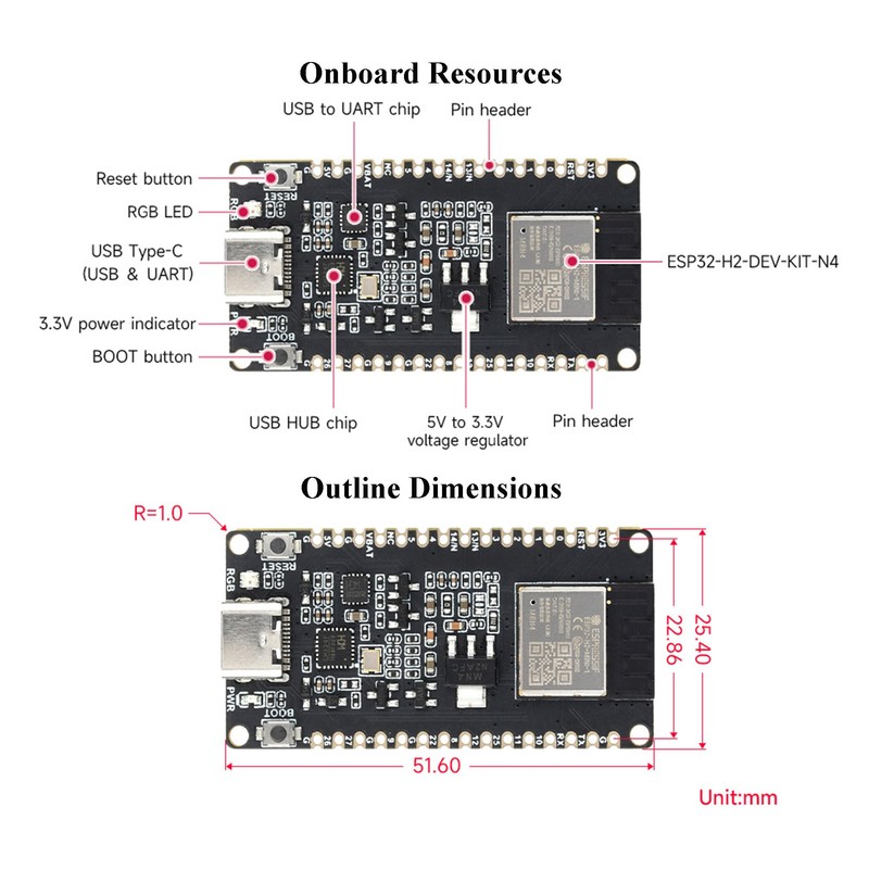 - Onboard CH343 and CH334 USB HUB chips, supports USB and UART development at the same time via a USB-C port. Compatible with the pinout of the ESP32-H2-DevKitM-1 development board, more convenient to use and expand a variety of peripheral modules