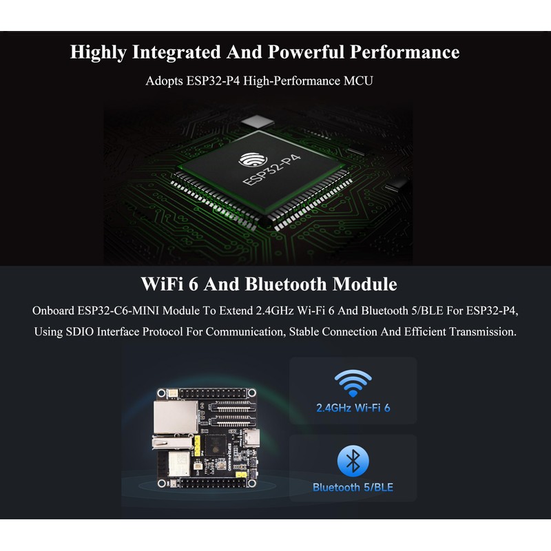 - 32MB PSRAM in the chip's package, with onboard 16MB Nor Flash. Adtaping 2*2*13 GPIO headers with 28 x programmable GPIOs. Onboard ESP32-C6-MINI module to extend 2.4GHz Wi-Fi 6 and Bluetooth 5/BLE for ESP32-P4, using SDIO interface protocol for communication, stable connection and efficient transmission.