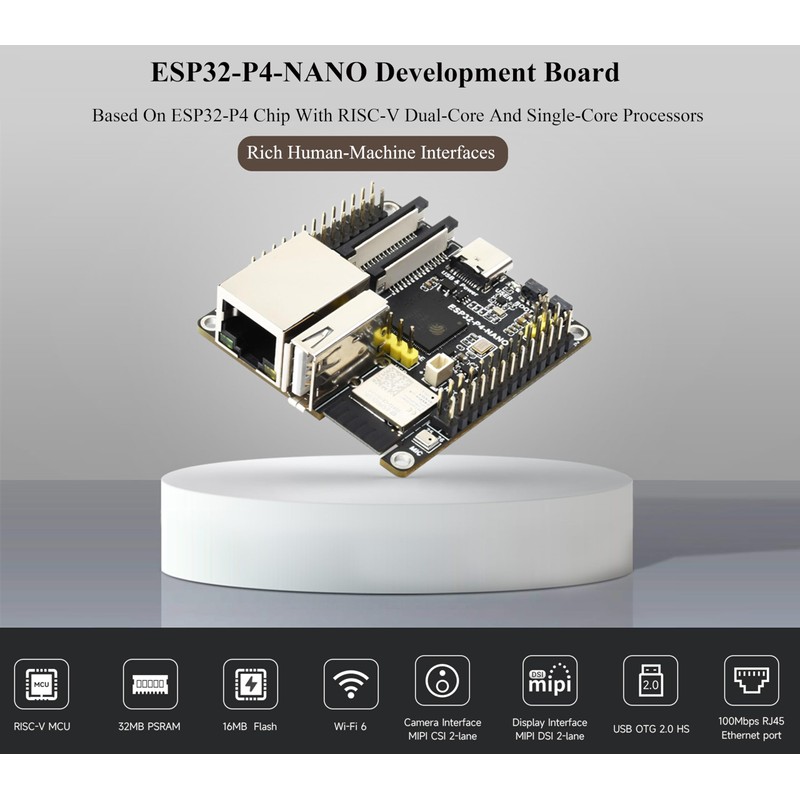 - ESP32-P4-NANO Development Board. Based on ESP32-P4 chip with RISC-V dual-core and single-core processors. 128 KB HP ROM, 16 KB LP ROM, 768 KB HP L2MEM, 32 KB LP SRAM, 8 KB TCM. And features rich Human-Machine Interfaces, including MIPI-CSI (with integrated Image Signal Processor) and MIPI-DSI interface.