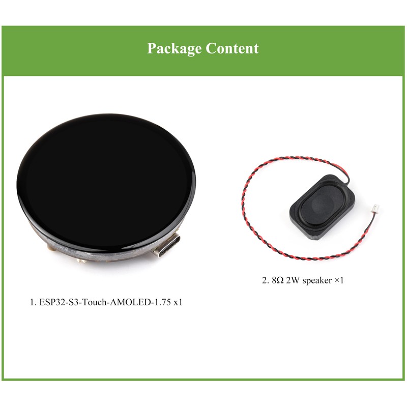 - Onboard 1.75inch AMOLED capacitive touch display for clear color picture display, 466 × 466 resolution, 16.7M color, 178° wide viewing angle. Adopts AMOLED screen, featuring advantages of high contrast, wide viewing angle, rich colors, fast response, thinner design, and low power consumption, etc.