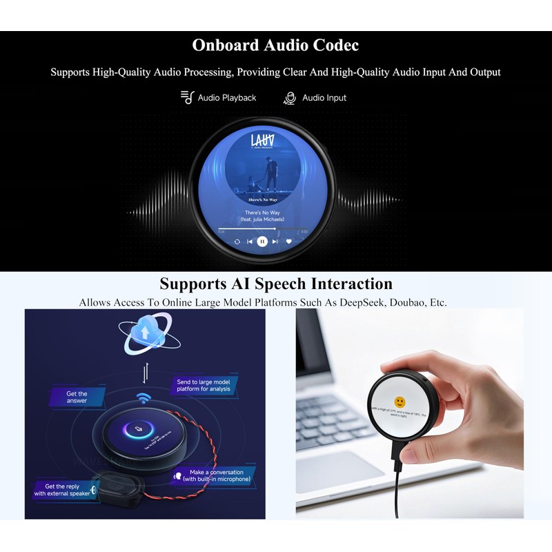 - Onboard audio codec: Supports high-quality audio processing, providing clear and high-quality audio input and output Supports AI Speech Interaction: Allows access to online large model platforms such as DeepSeek, Doubao, GPT,etc.