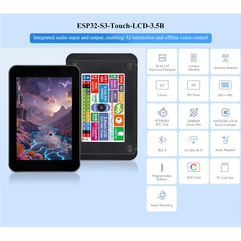 - Onboard 3.5inch IPS capacitive touch display for clear color picture display, 320 × 480 resolution, 262K color. Suitable for various smart device development, enabling human-machine interaction. Built-in AXS15231B LCD & touch controller, using QSPI and I2C communication respectively. Type-C connector, improving device compatibility, easier to use.