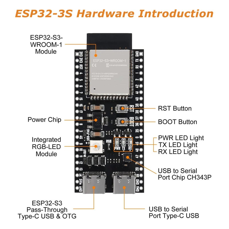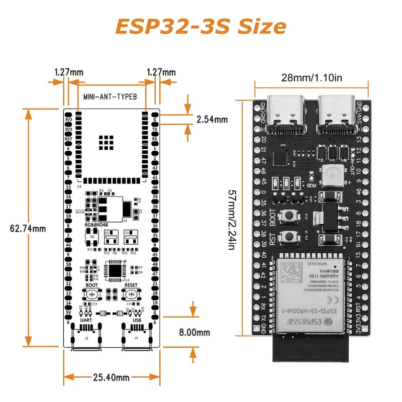 - 【Extensive Peripheral Support】: The ESP32 S3 supports numerous peripherals, including multiple analog inputs and outputs, I2C, SPI and UART interfaces, allowing easy expansion with various sensors or external devices.