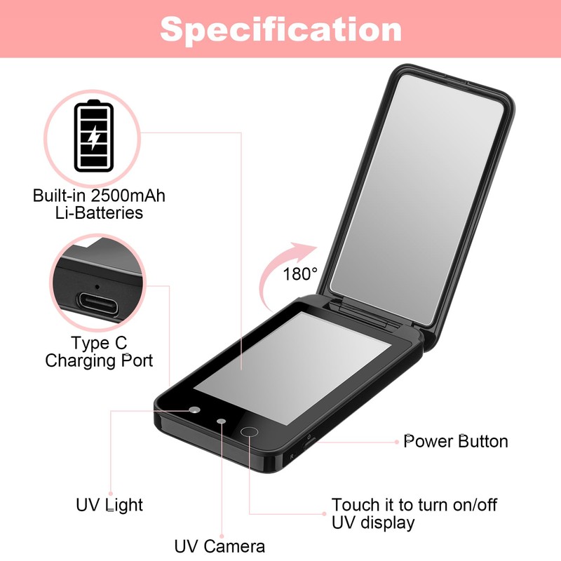 Espejo compacto UV con cámara UV para prueba de protección solar, espejo de viaje recargable de 4 pulgadas, espejo de bolsillo de doble cara para protección de la piel