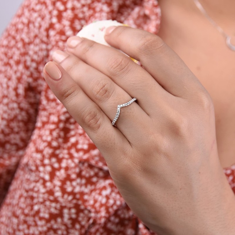 • Perfect for pairing - Shimmering scalloped pavé cz stones flow halfway down this band, creating a subtly curved chevron shape. This stylish ring is perfect on its own or paired with an engagement ring. You can't go wrong with this simple and classic choice as a wedding band or anniversary ring.