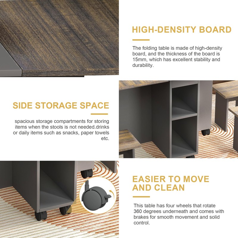 • *360° Wheeled Mobility* – Four smooth-rolling wheels with locking brakes let you effortlessly reposition this table set for impromptu dinner parties or workspace adjustments, giving small-space residents the freedom to reconfigure their living areas with ease.
