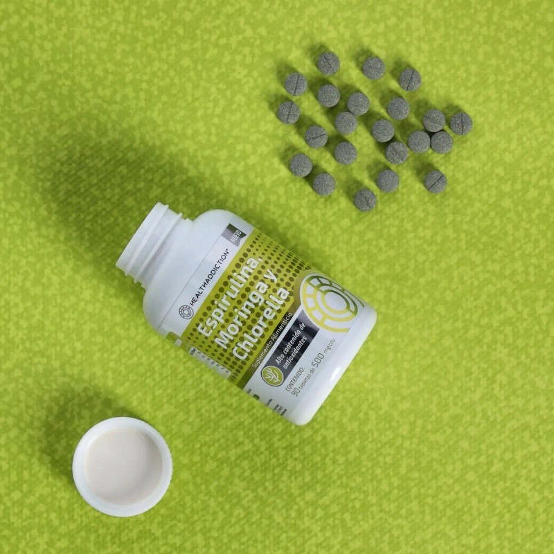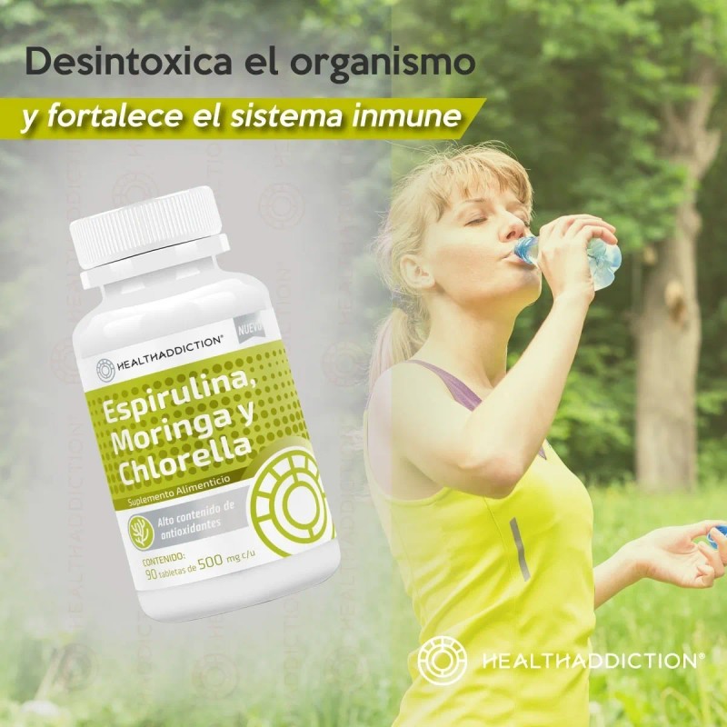 HealthAddiction Espirulina • Chlorella • Moringa es un potente suplemento herbal ideado para brindar múltiples beneficios en una sola tableta: