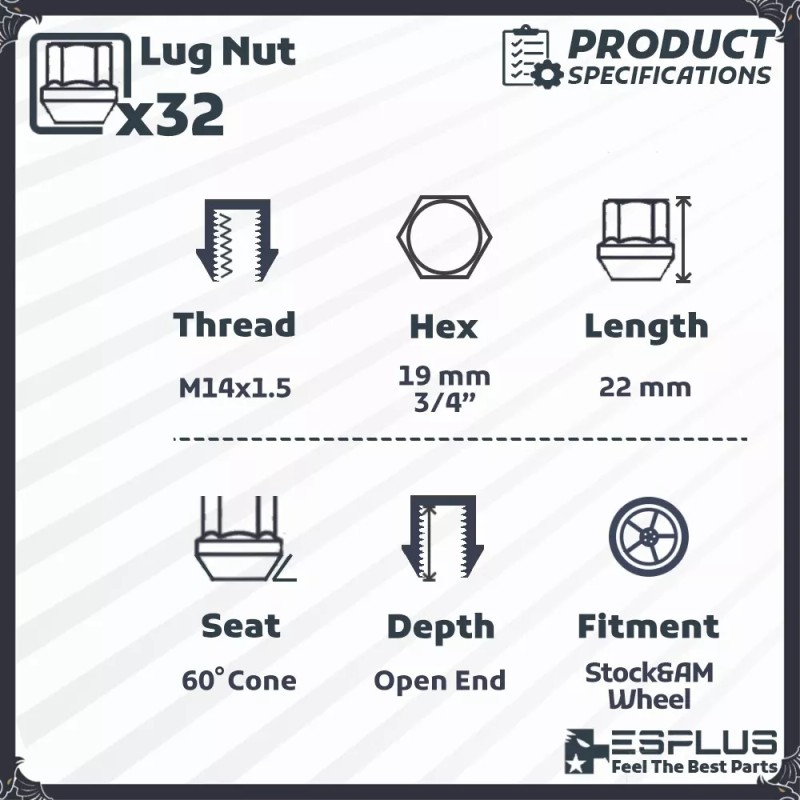 ESPlus 32Pc Chrome M14x1.5 Open End Lug Nut 3/4" Fit Nissan 2012-2021 NV1500/2500/35