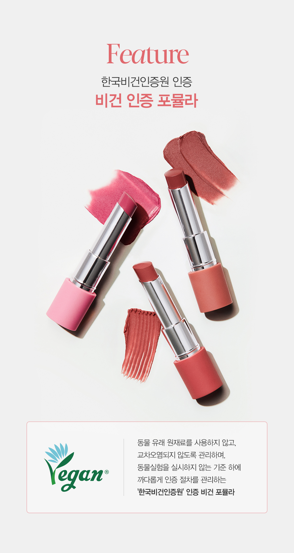 Gives a satisfying dopamine color blur lip upon application. Extend the lip line smoothly and fill the creases cleanly, creating a thick over-lip effect with a blur-extension effect. It is a blur volume effect that faintly creates lip wrinkles to create smooth lips. It creates a thick and three-dimensional blur volume lip that expands the lip line without boundaries with an extension effect that spreads without boundaries. A no-wear texture with a blurry finish that applies a comfortable thickness to smoothly fill the lips and expands smoothly without boundaries. Certified vegan by the Korea agency of Vegan Certification and Services.