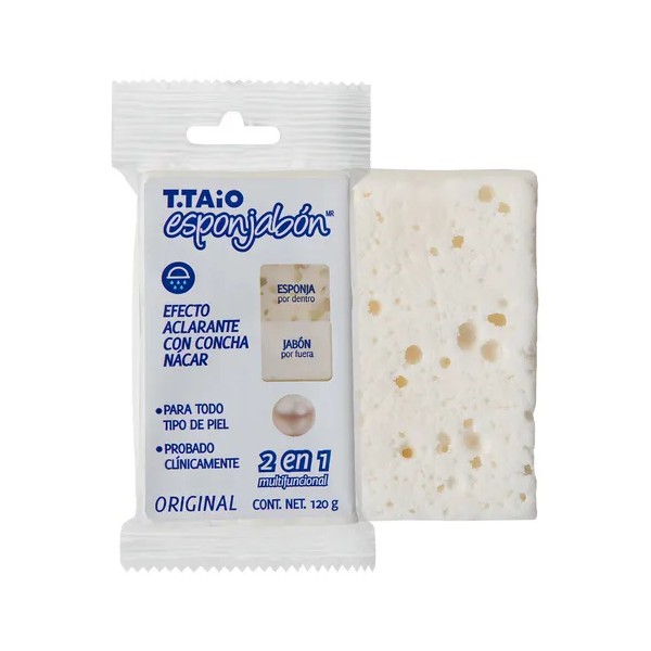 Imagina comenzar tu día con una sensación de pureza y renovación. El Esponjabón T.Taio de Concha Nácar está diseñado para conectar con tus sentidos más primitivos, activando una respuesta emocional que calma, reconforta y revitaliza. Su fórmula única no solo limpia, sino que despierta una sensación de cuidado y protección, llegando hasta lo más profundo de tu instinto de bienestar. Mantén uniforme el tono de tu piel utilizando diariamente Esponjabon con EFECTO ACLARANTE, ideal para disminuir o eliminar manchas y diferentes tonalidades en la piel gracias a la Concha Nacar, un aclarante natural. Este producto combina jabón y esponja en uno, aprobado por dermatólogos. Esponjabon contribuye a mantener una piel hermosa y saludable, siendo práctico tanto para el hogar como para viajar.
