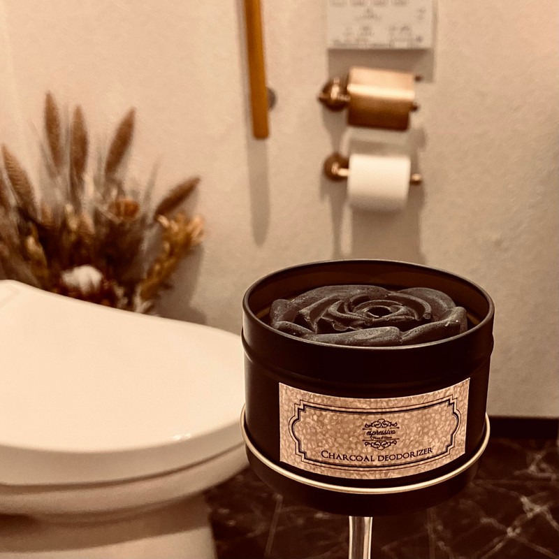 - Epressivo flower and aroma created charcoal deodorizer that is sustainable and decorative. Rose shaped charcoal in palm-sized tin. For smells on wooden clogs, toilets, refrigerators, and pets. Third-party tests show that ammonia decrease 89% in 30 minutes and 99% in 5 hours. This item is made from carbonized rice husks. Rice husk is the skin on the outside of the rice that is harvested during fine rice. Every year, since rice farmers generate a large amount of rice husks, they seem to be disposed of them. At espressivo, we focused on the deodorizing effect of charcoal made from this unnecessary. In fact, there are cases where they are used on the floor of the barnyard as a countermeasure against odors. Due to the nature of the product, small air bubbles may appear or not uniform color