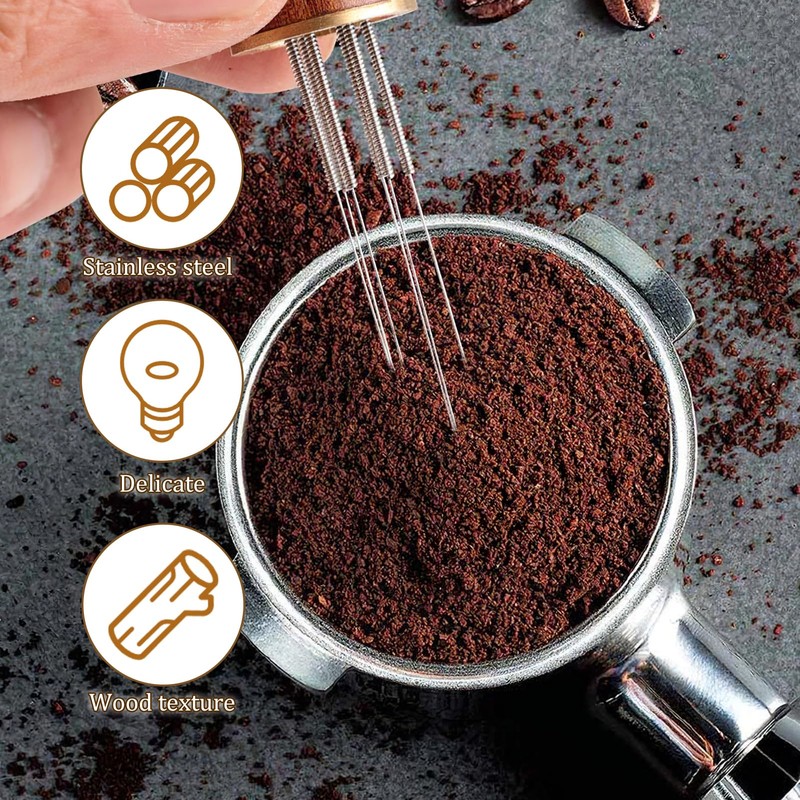 - High Quality Material: The needle of coffee distribution tool is made of stainless steel material, corrosion resistance, no rust, and a handle and base made of raw wood The surface is delicately polished and has a unique and beautiful texture.