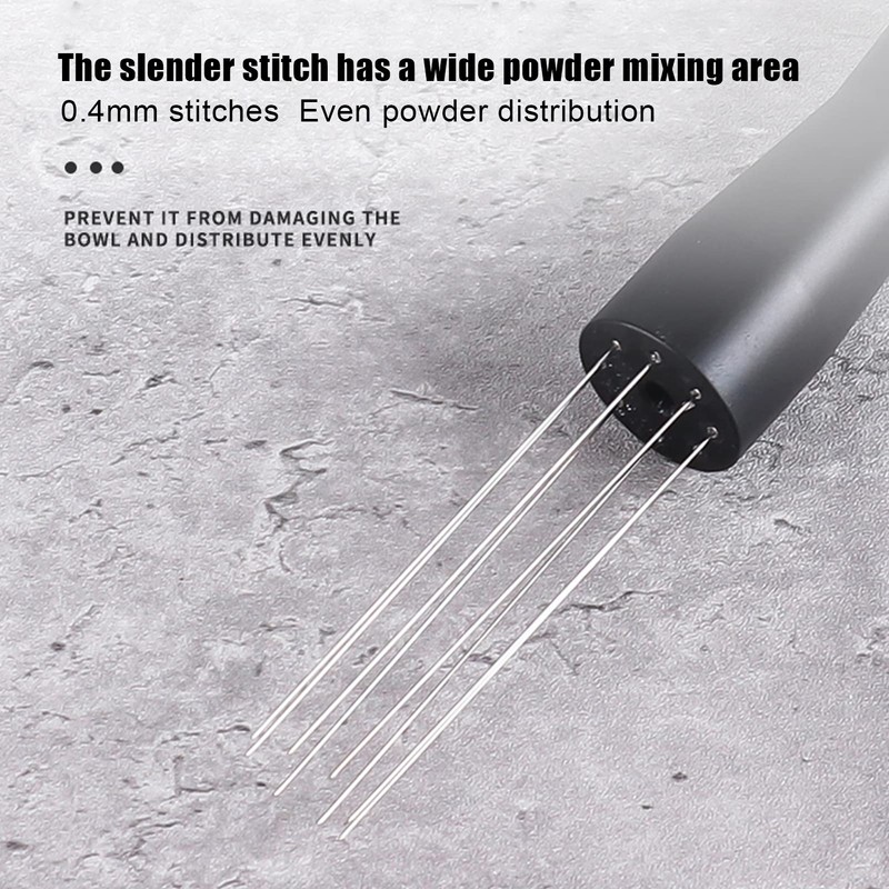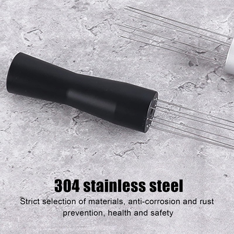 - Acero Inoxidable 304: Esta aguja de café en polvo está hecha de acero inoxidable 304 de alta calidad, que es resistente y duradero. El diseño en forma de de la puede ayudar a distribuir el café en polvo de manera uniforme, evitando rayones en la taza del filtro, y el área de agitación es más amplia.