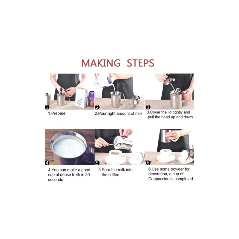- Fácil de usar.Simplemente agregue leche fría o tibia, bombee la perilla hacia arriba y hacia abajo y luego vierta