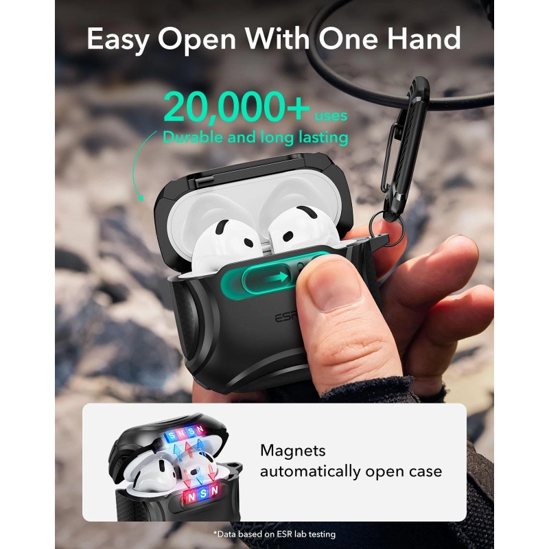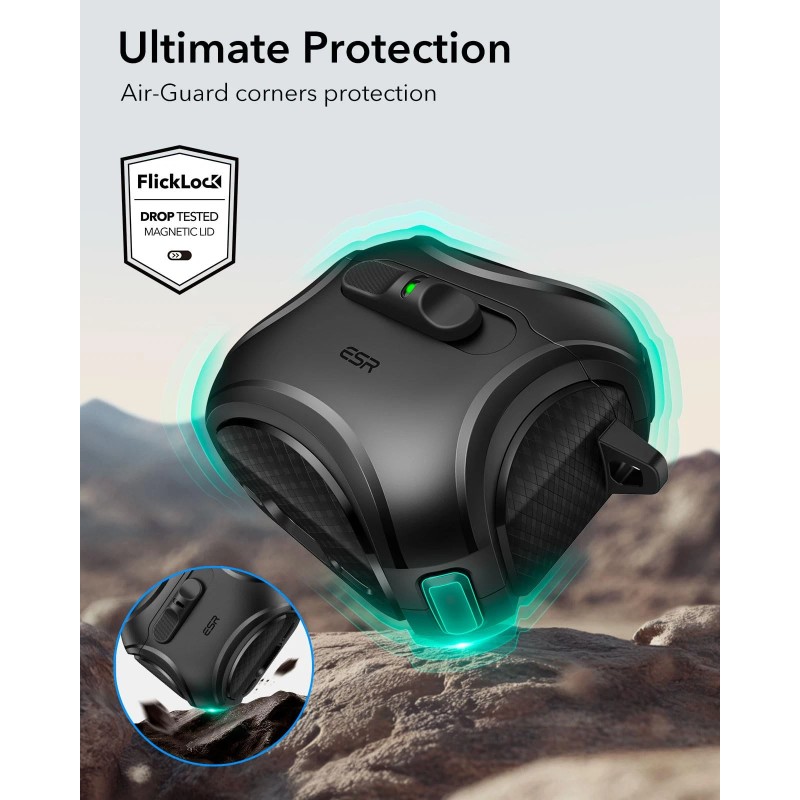 Secure FlickLock: strong magnets with 700 g of holding force in the top and bottom of the lid and an internal latch keep your AirPods locked safely inside so they won’t pop out if dropped