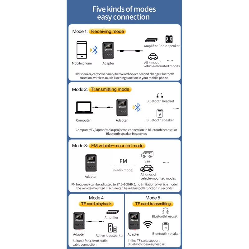 Diseño 2 en 1: como transmisor, puede convertir televisores, ordenadores, reproductores de CD, etc. sin Bluetooth en transmisores Bluetooth. Como modo receptor, la función de transmisión inalámbrica se añade inmediatamente al sistema estéreo antiguo doméstico.