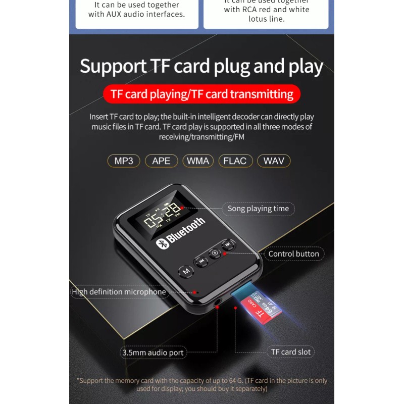 Lector de tarjetas TF y escucha manos libres: Todas las canciones de tarjetas TF se pueden reproducir en los modos de recepción y transmisión. El micrófono incorporado de alta sensibilidad puede hacer que su viaje sea seguro, admite escucha de canciones con manos libres/navegación/llamadas/transmisor FM.