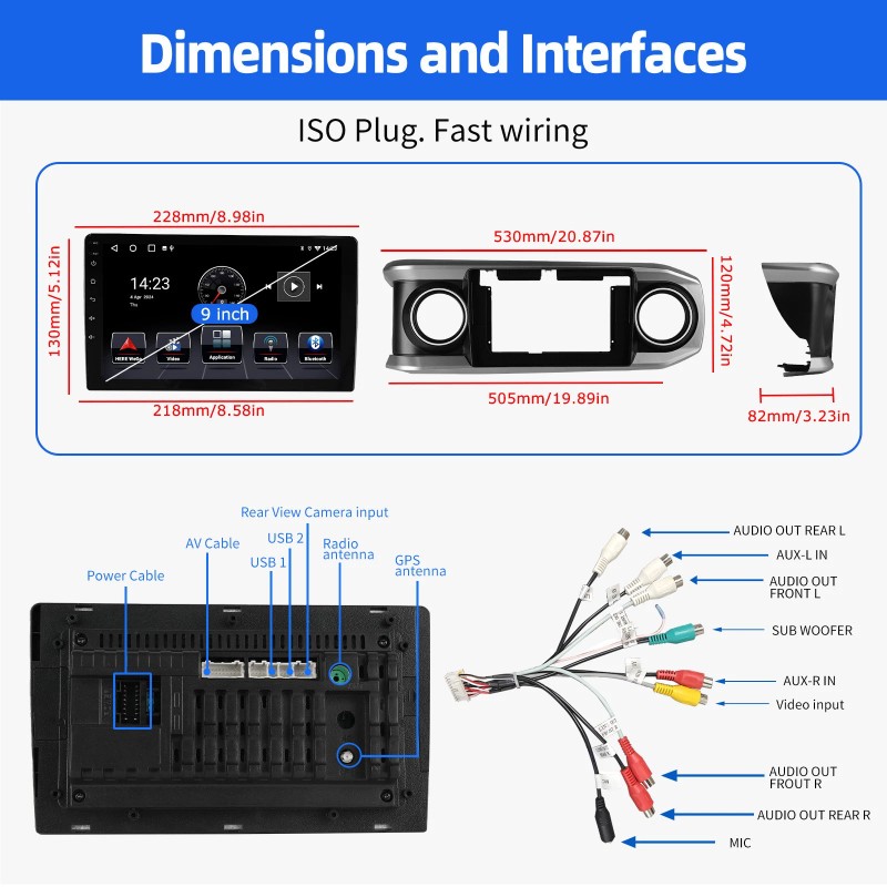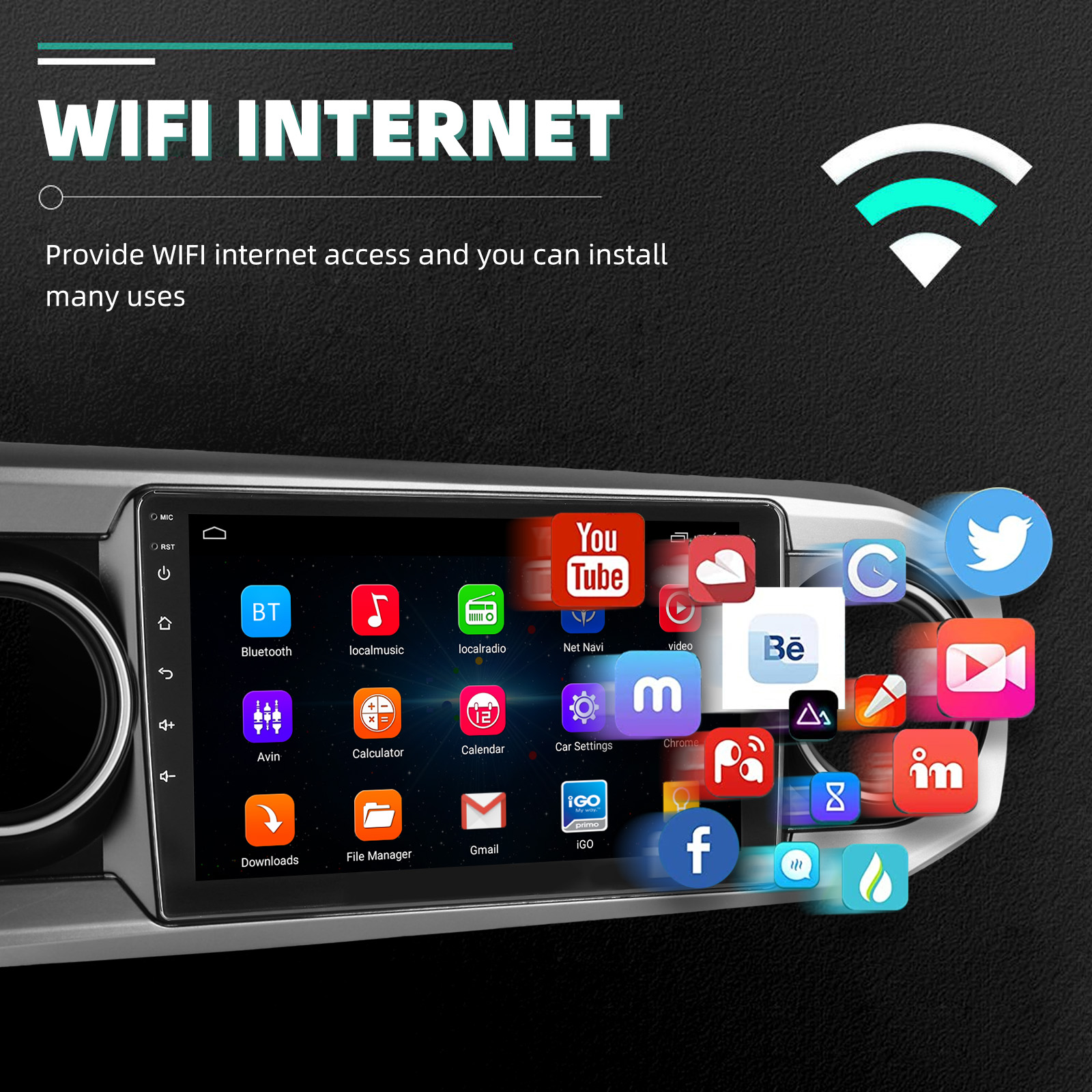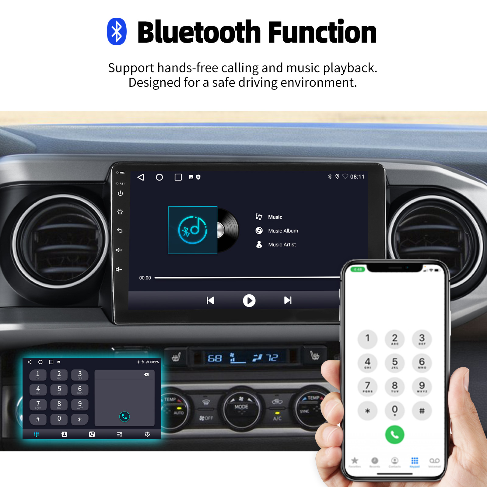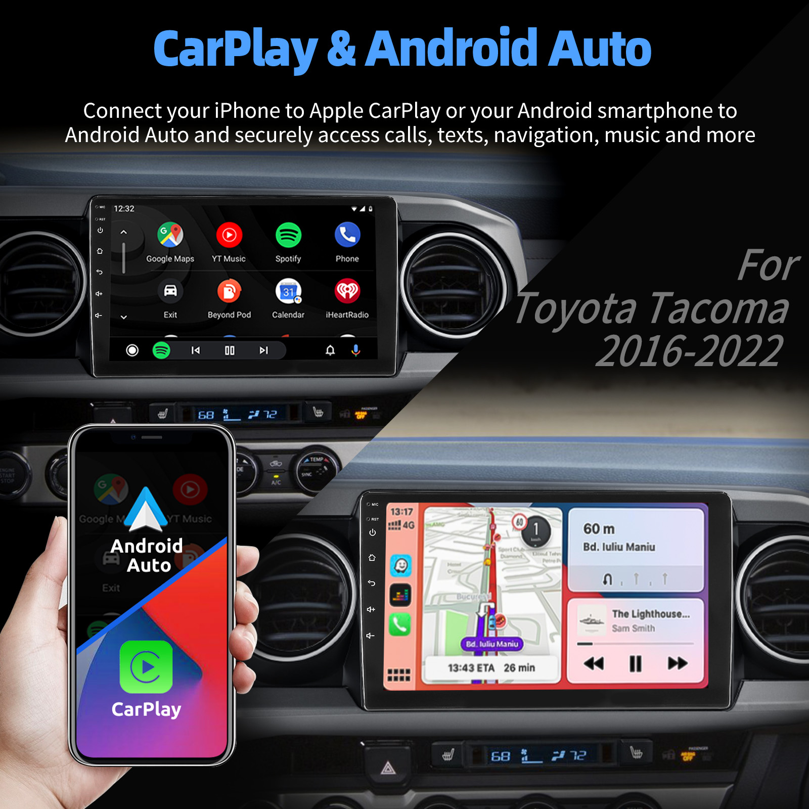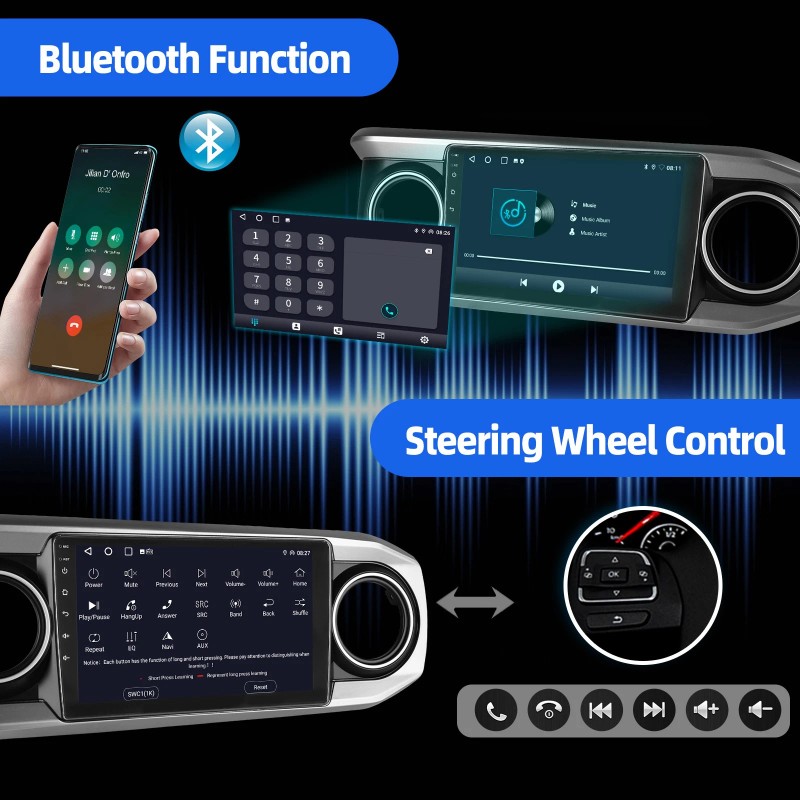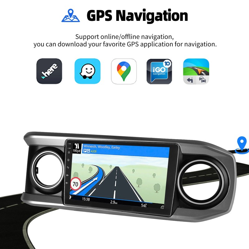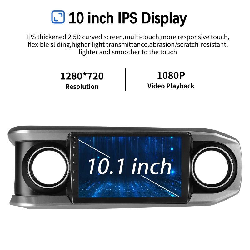 10.1 Inch Android 14 Car Radio For Toyota Tacoma 2016-2022: The Android car radio with 10.1" 1280* 720 HD IPS capacitive touchscreen, 2GB RAM and 32GB ROM allows you to download your favorite apps and videos, so driving is no longer boring. No extra frame, no cable change, plug and play. It comes with Canbus and supports most original functions: Steering wheel control, reverse signals and reading original computer data, etc.