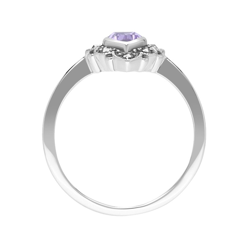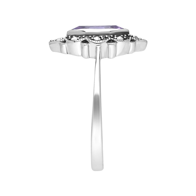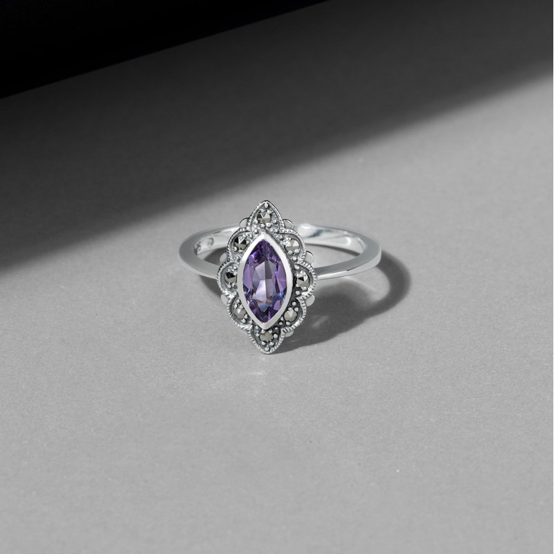 - This elegant ring features a marquise cut Amethyst center and is perfectly complemented by the sparkling Marcasite gemstones. The overall styling of the ring has a distinct art nouveau feel about it.